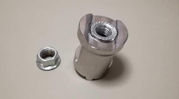 後日、更なる改善。自動車のスタビリンク用、フランジナット M10 P1.25(直径19mm、高さ9mm)をメルカリで見つけて購入。
