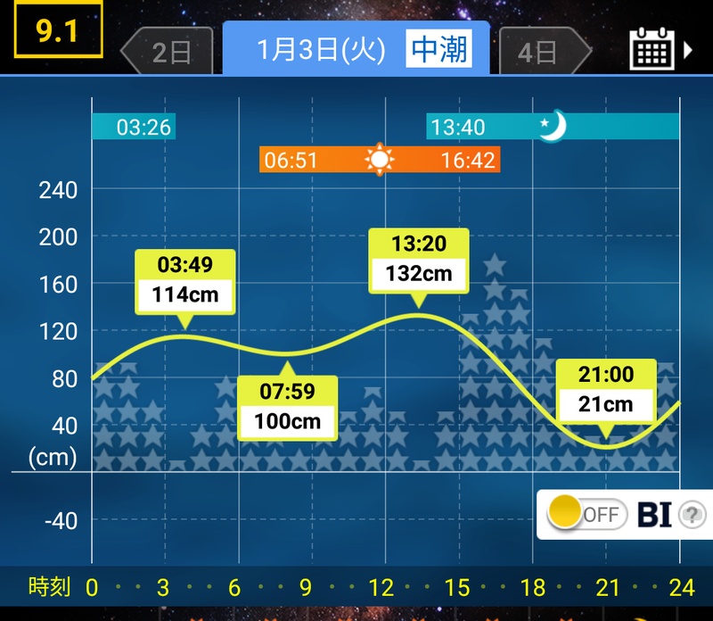 タイドグラフの13時過ぎ、潮止まりで活性が下がる時間になりました。