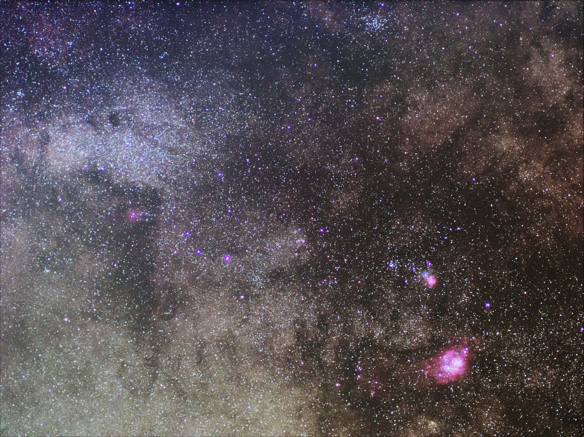 いて座付近(バンビの横顔、三裂星雲(M20)、干潟星雲(M8)、M23球状星団)
